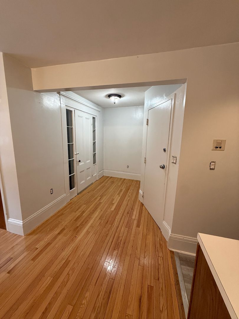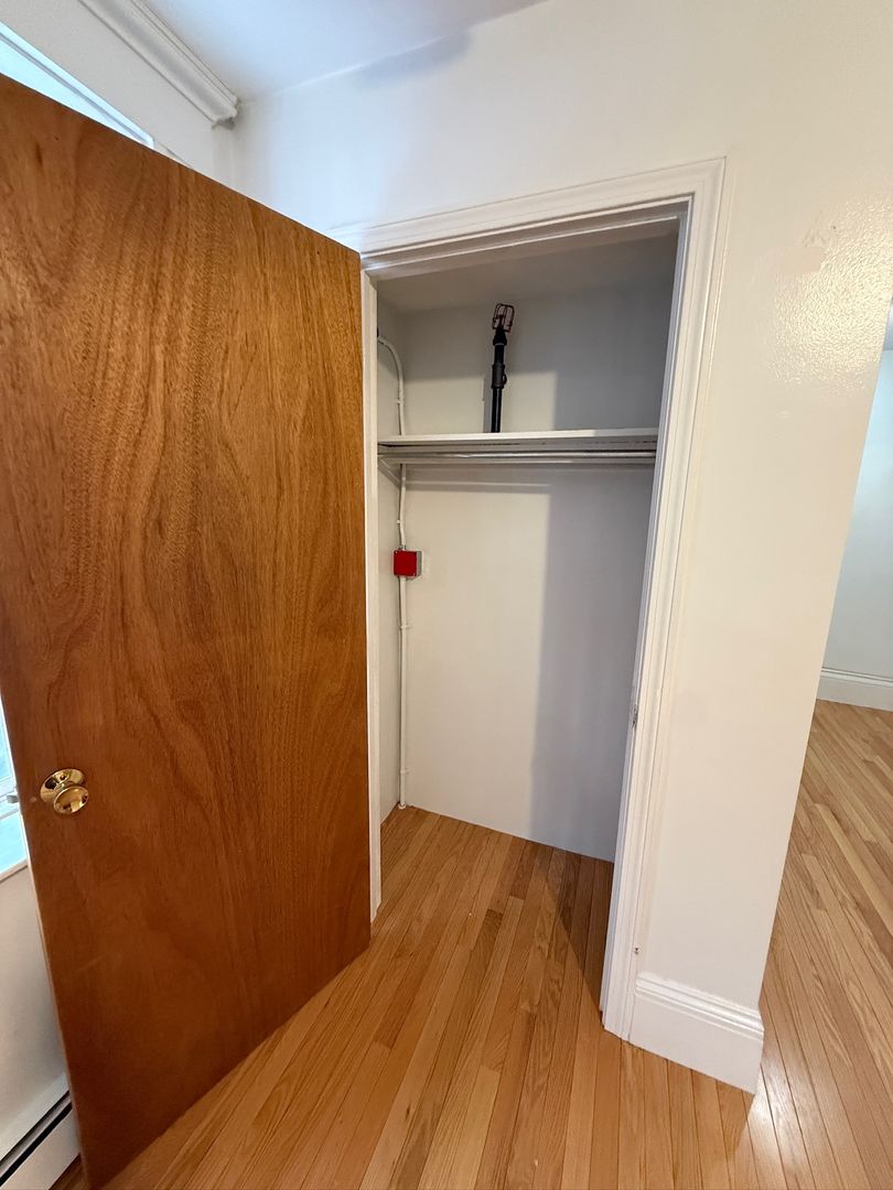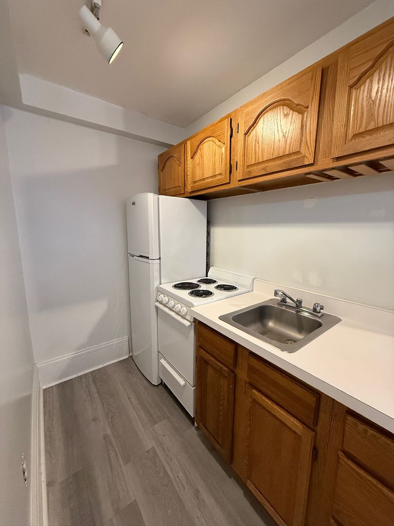 This front-facing unit receives excellent natural light and includes hardwood floors throughout. The separate galley kitchen features tile flooring, and includes a full bathroom. Heat, electricity, and hot water are included in the rent. Building residents also enjoy access to a private fenced backyard and free common laundry.